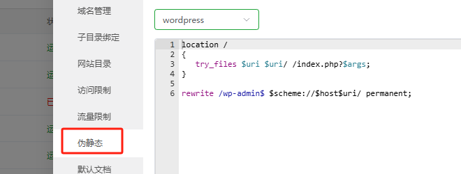 如果你使用的宝塔面板就更简单了,复制上面这段代码直接在宝塔面板的SSL里面粘贴进去就行了,或者在伪静态里面直接选择WordPress就可以了,如下图。